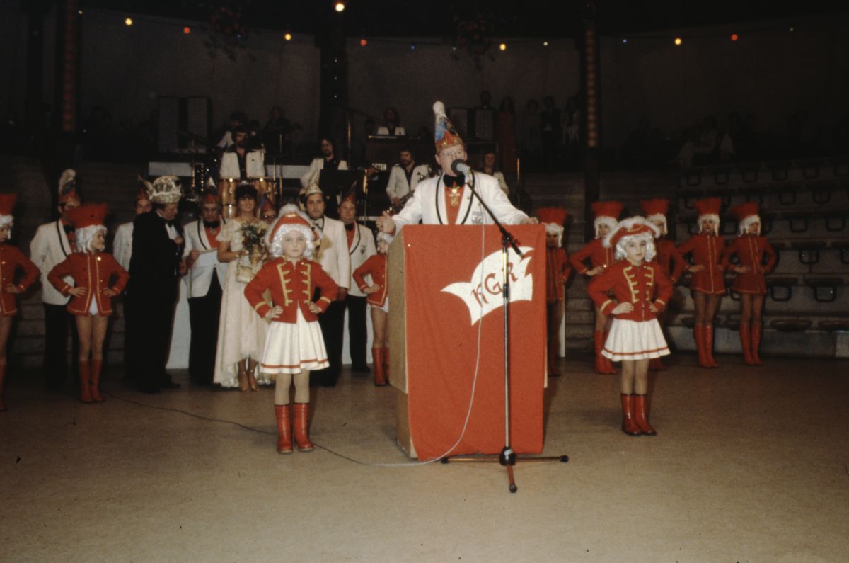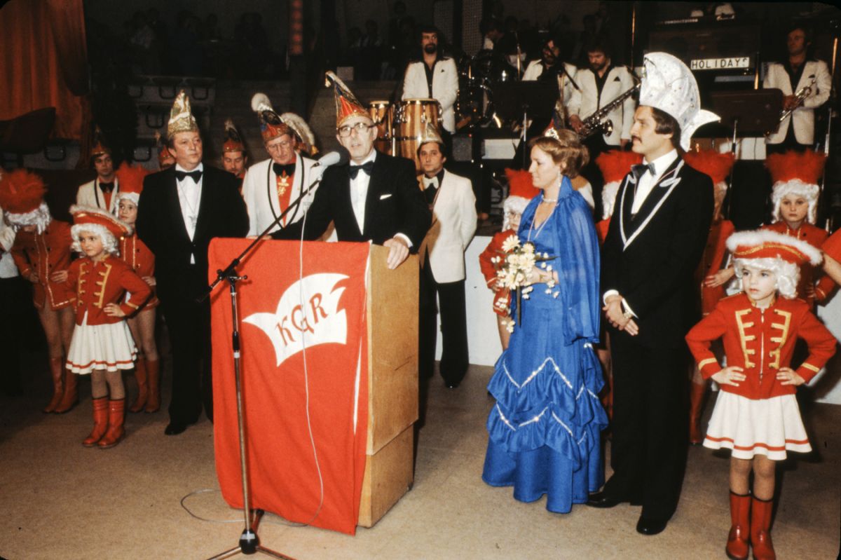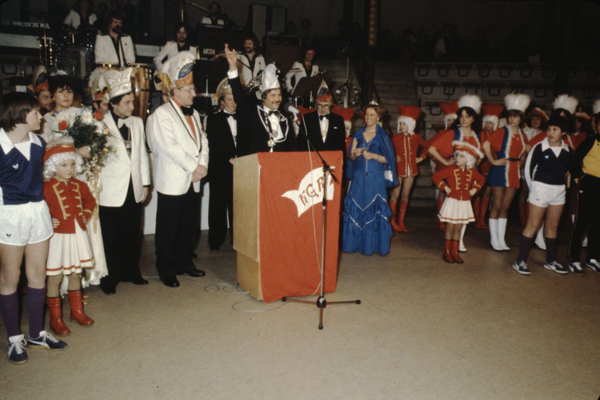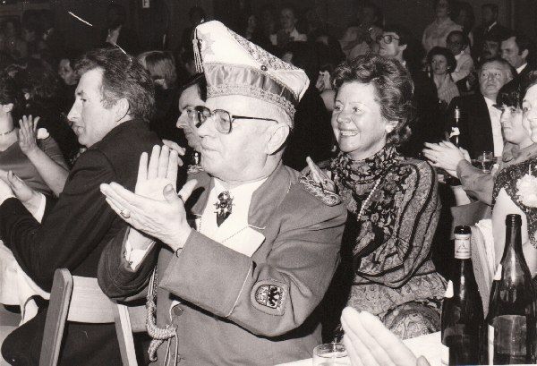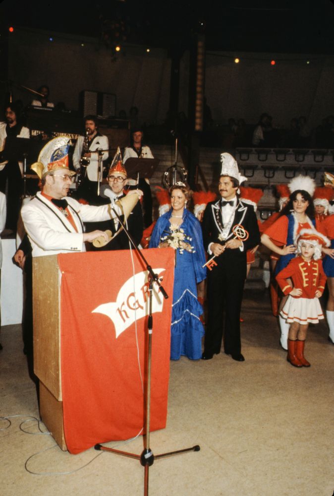 Der Besuch war als sehr gut zu bezeichnen und auch diesmal musste wieder die Feststellung getroffen werden, dass gut die Hälfte der Besucher von auswärts gekommen waren. Und gerade diese Gäste aus der engeren und weiteren Umgebung von Rülzheim waren sich einig in der Feststellung, dass die Innenausstattung der Rundhalle einfach als unübertrefflich zu bezeichnen ist. Die Kapelle hatte die Gemüter schon gut vorgeheizt als der I. Vorsitzende Karlheinz Pfeifer den Machtwechsel im Rülzheimer Narrenleben ankündigte. Eine zahlreiche Abordnung aus Berg, mit Prinzenpaar, Elferrat, Vorstand und Prinzengarde, verschönerten das farbenprächtige Bild, als die kleine Garde zum Abschied des alten Prinzenpaares tanzte. Das alte Paar wurde herzlich verabschiedet und das neue Herrscherpaar mit stürmischem Jubel empfangen.