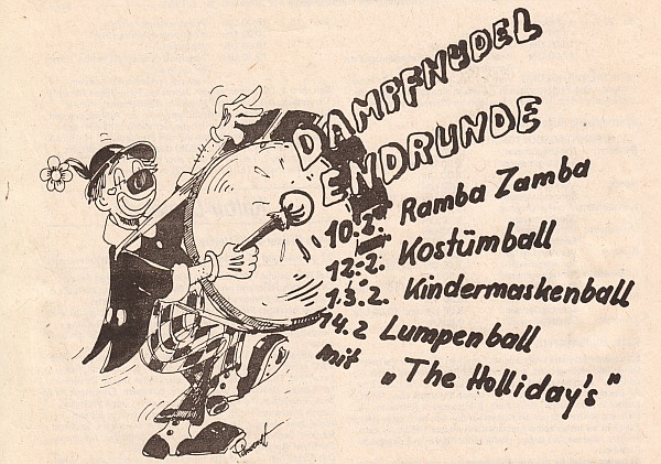 Höhepunkt des Rülzheimer Mammutprogramms waren zweifelsohne der Große Kostümball, mit Prämierung der Masken und einer gekonnt vorgetragenen Einlage der KGR-Rock´n Roll-Gruppe. und der Lumpenball, am Rosenmontag. Kein Wunder, dass das jeweils mehr als achtstündige, Faschingstreiben den überhitzten Gästen noch viel zu kurz erschien. Für Essen und Trinken war reichlich gesorgt; bei der Prämierung ließ sich die KGR mit über 40 Preisen auch nicht lumpen und die Kapelle „The Holidays" tat das Ihrige, so dass diese drei Tanzabende bestimmt die beste Werbung für das kommende Jahr waren.