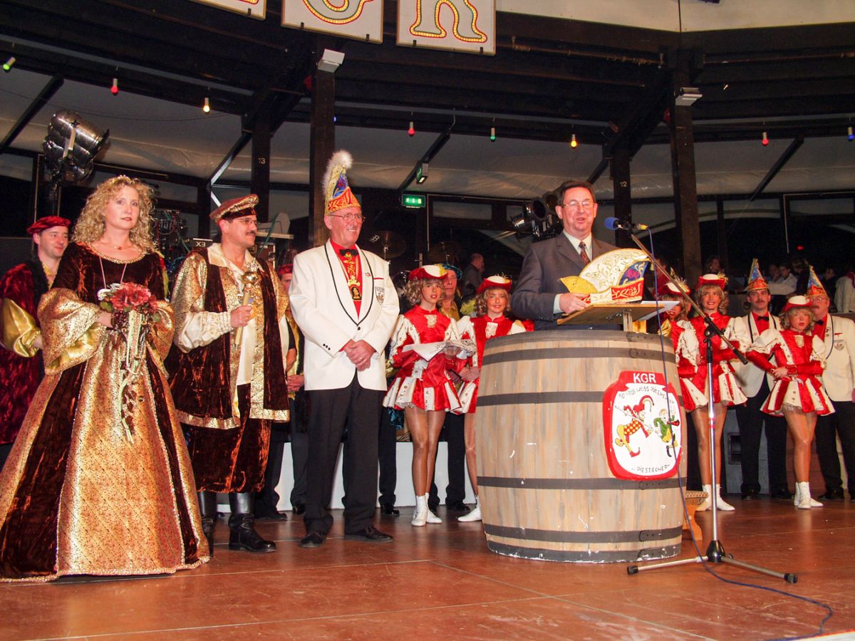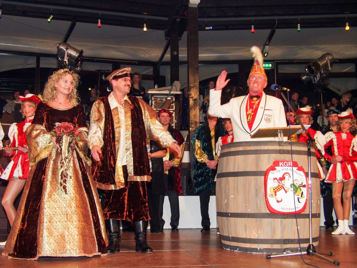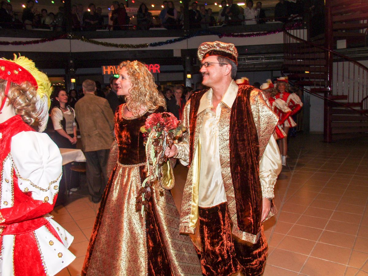 Wer wird Prinzenpaar in Rülzheim? Mit dieser Frage kamen alle Gäste zur Faschings-Gala am 5. Jan 2002 in die Rülzheimer „Gute Stube“ Dampfnudel. Die Stecher hatten gerufen und es kamen wirklich viele Gäste, die sich dieses „Edel Event“ nicht entgehen lassen wollten. Eine neue Band für Rülzheim „Die Cherries“ konnte von Anfang an zeigen, man darf sich auch bewegen, sogar tanzen. Eine Profiband, die in vielen Tanzsälen zu hause ist, fand immer den rechten Kontakt zum Publikum. Der Vorsitzende der Karnevalsgesellschaft, Edi Harder, konnte ein begeisterungs fähiges Publikum im stimmungsvoll gezierten Haus begrüßen. Das Motto der Kampagne war auch nicht zu übersehen: Die Reisen des Cristoph Columbus.