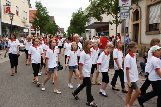 Angelangt auf dem Kerweplatz erhielt jeder Teilnehmer ein frische Brezel vom Bürgermeister, Dankeschön. Selbiger wurde wieder einmal zum Hauptakteur beim Bieranstich. Genau 4 mal 11 Einzelhiebe ließ der Schultheiß auf den Hahn des Bierfasses nieder, bis sich der Großteil des Fässchens sich auf den Boden ergoss.