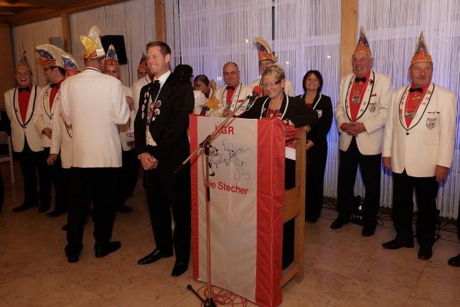 Danach hatte das Prinzenpaar die ehrenvolle Aufgabe den neuen Jahresorden an die Elferräte, den Ehrenmitgliedern, den Helfern im Wirtschaftsbetrieb und der Licht- und Tontechnik zu überreichen. Als Motiv für den Orden wurde in diesem Jahr das Kulturzentrum ausgewählt. Dazu der passende Text: „Die Vereine zieh-n jetzt um, ins Rilzemer Kulturzentrum“.