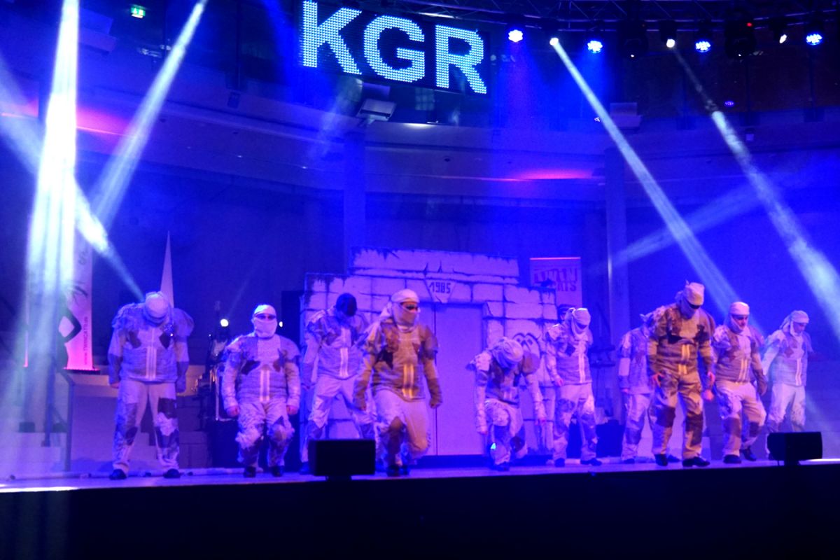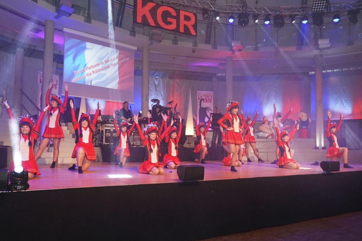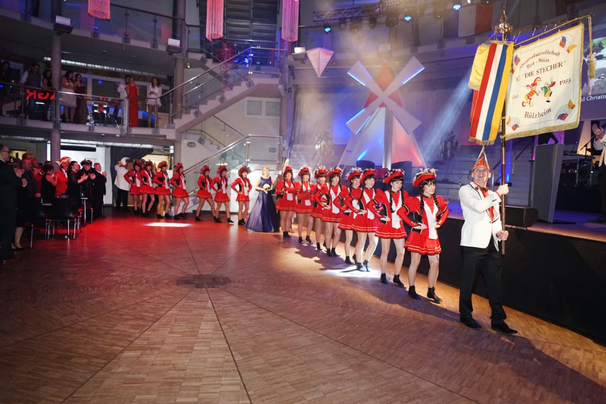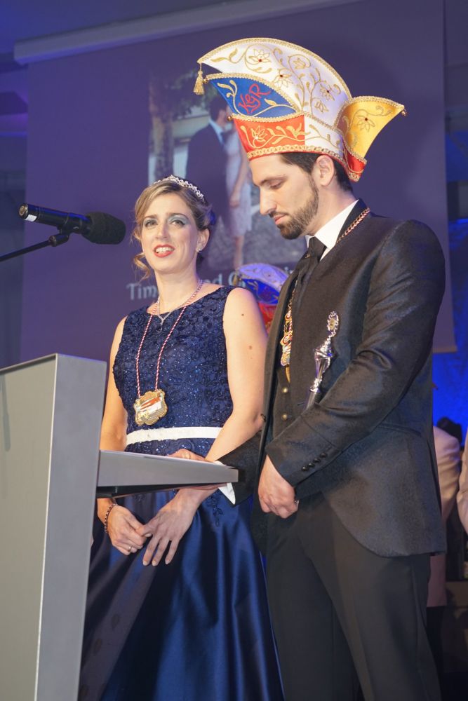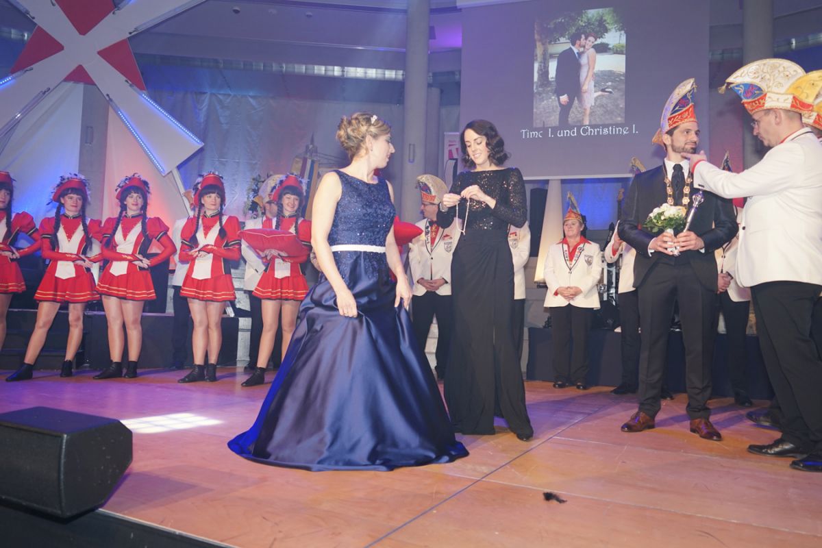 Direkt zu Beginn konnten die Gäste selbst das Tanzbein schwingen und die Band TWINCATS sorgte für gute und perfekte Tanzmusik. Im Anschluss zeigte die Stechergarde – das tänzerische Aushängeschild der KGR – ihren neuen Gardetanz. Während der anschließenden zweiten Tanzrunde ent-schwanden Vorstandschaft und Elferräte in den Anbau, um dort das neue Prinzenpaar willkommen zu heißen. Sitzungspräsident Michael Haag moderierte ein Ratespiel, bei welchem die Tipps auf die neuen Regenten, getreu dem Motto, in Französisch genannt wurden. Sofern die Gäste den Sinn des Tipps erkannten bzw. übersetzen konnten, wurde ein weiterer Buchstabe auf der Leinwand sichtbar. Bei der Auflösung der beiden Namen war der Jubel in der Halle groß und das neue Regentenpaar zog mit Garde und Elferräten in die Dampfnudel ein. Martin Olfens übergab die Insignien der Macht, Bürgermeister Reiner Hör musste den Rathausschlüssel abgeben und Anna-Maria Müller-Bartl legt der Prinzessin noch die Kronjuwelen an. Die neuen Regenten begrüßten dann ihre Untertanen und stellten ihr närrisches Regierungsprogramm vor. Nach dem anschließenden Ehrentanz, anfangs alleine, dann von Elferräten und Gardemädchen unterstützt, konnten Prinz Timo I. und Prinzessin Christine I. die Gratulationen entgegennehmen.