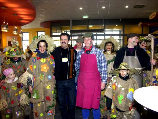 Erstmals hat sich die KGR entschieden, aktiv auf einem Umzug, auswärts, teil zu nehmen. Bei den Freunden aus Herxheim sollte die Teilnahme dann auch sein. Früh am morgen trafen sich die ersten Teilnehmer in der Narrenburg, um das mühsam und selbst gefertigte Kleidungsteil anzulegen. Natürlich musste auch noch etwas Farbe ins Gesicht. Man hatte sich zwar entschieden als Vogelscheuchen sich zu präsentieren, aber es sollten schließlich ja nette Vogelverjager sein. Die Kleidung bestand ursprünglich aus Kartoffelsäcken, die wiederum so edel verarbeitet wurde und ausgeschmückt war, dass es richtig nett aussah. Zu den Vogelscheuchen passten natürlich die als Bauern maskierten Herren, die ja die Beschützer der Ackerfrüchte sind. Ein einzelner Vogel hatte es gewagt zwischen den ganzen Scheuchen sich zu platzieren. Und dies war auch noch ein lahmer Hubflügler, ein Gockel.