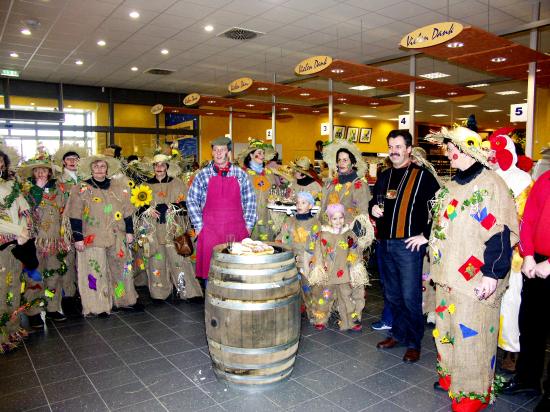 Gegen 10 Uhr traf sich alles beim Edeka – Markt. Herr Fitterer, der Betreiber des Marktes, hatte alle Umzugsnarren zu sich geladen. Kredenz wurde natürlich das Narrengetränk Sekt und dazu Fasenachtskichle. So gestärkt konnte man sich nach Herxheim begeben. Herr Fitterer hatte die Narrenschar und ihr historisches Fuhrwerk mit etlichen Kartons süßem Wurfmaterial bedacht, so dass man richtig gewappnet war.
