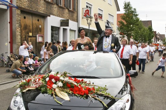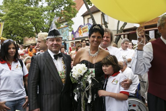 Die Kleinsten Mini und Bambini an der Spitze und viele, viele weitere Karnevalisten folgten. Der Höhepunkt der großen Narrenschar war natürlich das Prinzenpaar Cosima die I. und Elmar der I. Aus einem schön, mit Blumen dekorierten Cabrio, der Familie Bouché , winkten die beiden närrischen Tollitäten ihren Untertanen zu. Etliche Bonbons vom Prinzenpaar geworfen, fanden bei den Kindern am Straßenrad dankbare Abnehmer. Der laut Helau rufende Elferrat bildete den Abschluss der Narrenschar.