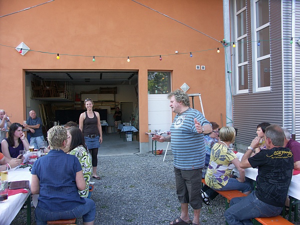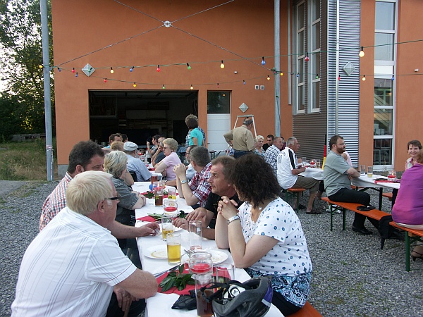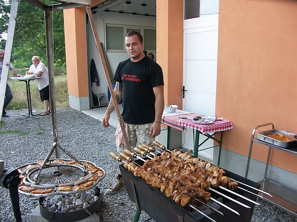 Schon zum wiederholten Mal trafen sich die Karnevalisten am neuen Vereinsheim, dem Anbau zur Dampfnudel um ihr Grillfest zu feiern. Natürlich war es dem Prinzenpaar Simone und Eric vorbehalten das reichhaltige Buffet zu eröffnen. Der Wirtschaftsausschuss um Yvonne und Klaus Tüllmann hatten sich wieder einmal alle Mühe gegeben den hungrigen Stechern was zu bieten. So gab es denn auch tatsächlich für alle etwas, denn unser Narrenmetzger Ginder hatte alles arrangiert, so dass der werdende Papa Florian Fischer seinen eigens konstruierten Grill voll einsetzen konnte. Zu seiner Ehre wäre zu erwähnen, dass er Würstchen, Steaks und Brocken ideal garte.