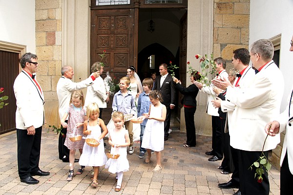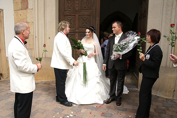 Das in Rülzheim sich trauende Paar besteht aus der Tochter des Träger des Golden Löwen mit Brillant, Willi Kupper, nämlich Heike und dem Sohn des 2. Vorsitzenden Bernd Fischer, nämlich Florian. Dieser ist schon seit einigen Jahren im Beirat der Stecher und unterstützt durch sein handwerkliches Geschick viele Aufbauarbeiten. Heike und Florian gaben sich in der Mauritiuskirche das Ja-Wort und der Beirat durfte beim Empfang nach der Trauung natürlich nicht fehlen. Bei einem kleinen Umtrunk unter der Platane konnte dem glücklichen Paar die guten Wünsche ausgesprochen werden. Auch hier noch mal an alle glücklich Vermählten die besten Wünsche von den Stechern.